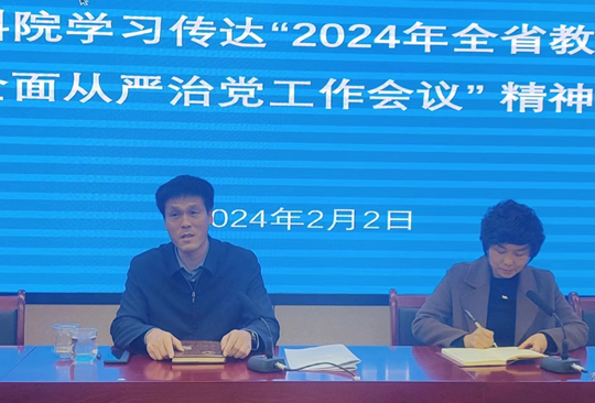 会上,党委书记、院长赵洪涛传达了省委副书记、省长任振鹤对教育有关批示精神;传达了省委教育工作领导小组秘书组组长,省委教育工委书记,省教育厅党组书记、厅长张国珍在全省教育大会上的工作报告和省教育厅党组成员、省纪委监委派驻省教育厅纪检监察组组长雷江红对教育系统全面从严治党和党风廉政建设的安排部署。